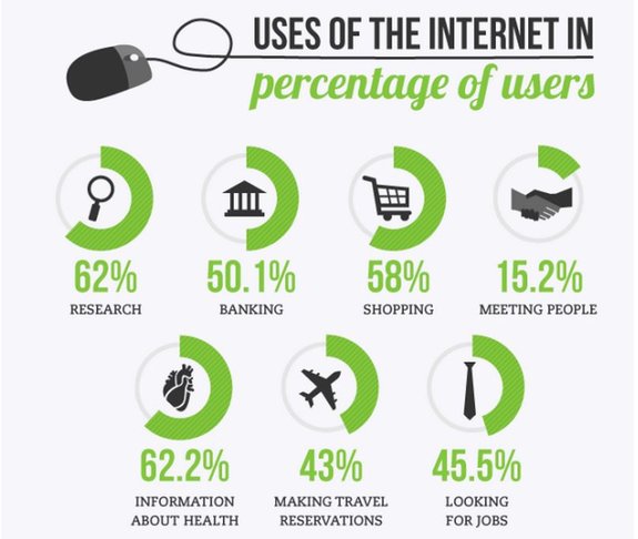 İnternet, gün içerisinde en çok (%62 oranıyla) araştırma amacıyla kullanılıyor. Sağlık amacıyla yapılan araştırmaları da %62 içerisinde kabul edebiliriz. Daha sonra, %58 ile alışveriş ve %50 ile bankacılık işlemleri geliyor. Turizm ve iş arama konusunda da internetin yoğun bir şekilde kullanıldığını gözlemliyoruz.